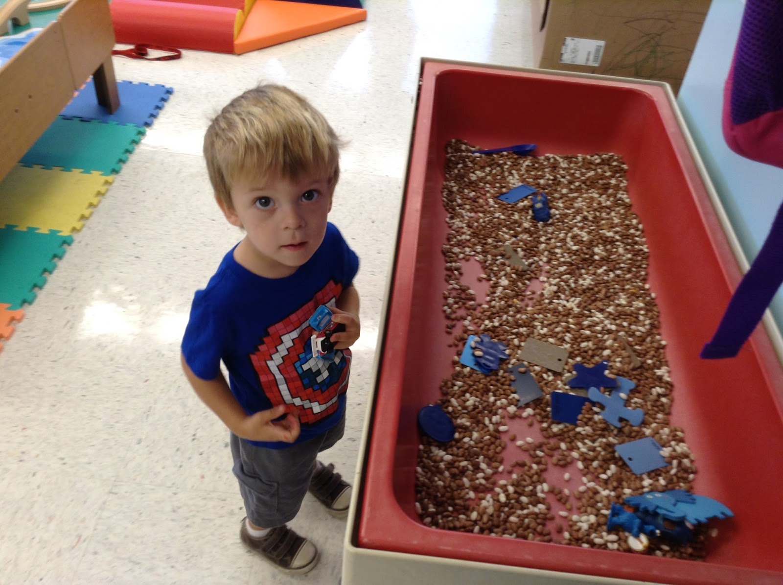 This week we are learning about God and Creation. We know that on Day 1, God separated light and darkness, God said,"It was good" and it was. We are also learning about Day 2 of Creation, when God made the sky and water. It too was good. We are exploring the color blue, #1 and square. The children are painting with blue paint, finding blue in the classroom, using a blue grab bag to ID blue objects. They use language skills to describe the objects and tell how these objects are used. The boys and girls played a color matching game using various colored squares. Our friends have tested their fine motor skills by stacking blue cubes. Of course, all of the girls and boys have enjoyed the climber, balance beam, kitchen set, couch, large vinyl stacking cubes and the other new toys that were purchased for us through PTL If you know a member of the PLT board thank them. The children decorated a thank you card. and Cheryl Haun presented to them at the last meeting. Other centers included the train table, shape sorter, vehicles, white/chalk easel, large blocks, box, puzzles, crayons and drawing, sensory table, housekeeping, play doh, big blue mural, dancing with streamers, music and movement, recess and gardening. Today was an awesome day in ELP.