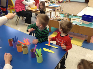 Matching colored stick to the same color container.